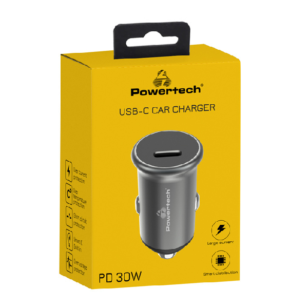 Φορτιστής αυτοκινήτου POWERTECH PT-1147, USB-C, 30W PD, γκρι. Υψηλής απόδοσης φορτιστής, συμβατός με όλες τις συσκευές που φορτίζουν μέσω θύρας USB-C.