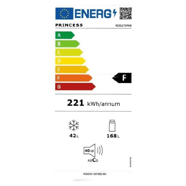 Ψυγείο δίπορτο της Princess με χωρητικότητα 210 λίτρα, που μπορεί να καλύψει τις ανάγκες ενός ή δύο ατόμων.