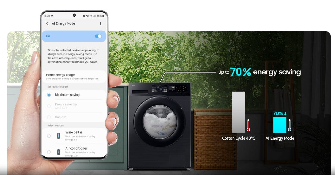 Θες να έχεις τον έλεγχο του πλυντηρίου σου και να εξοικονομείς ενέργεια χωρίς κόπο; Με το SmartThings AI Energy Mode, μπορείς να παρακολουθείς και να ρυθμίζεις τη χρήση ρεύματος σαν… μαέστρος της οικονομίας! Όταν ενεργοποιείς το AI Energy mode, το πλυντήριο σου “σκέφτεται” οικολογικά για εσένα. Πώς; Μειώνει την κατανάλωση ενέργειας έως και 70%, χρησιμοποιώντας κρύο νερό αντί για ζεστό και λίγο περισσότερο χρόνο στο πλύσιμο. Έτσι, τα ρούχα σου καθαρίζουν τέλεια και το πορτοφόλι σου μένει πιο γεμάτο.