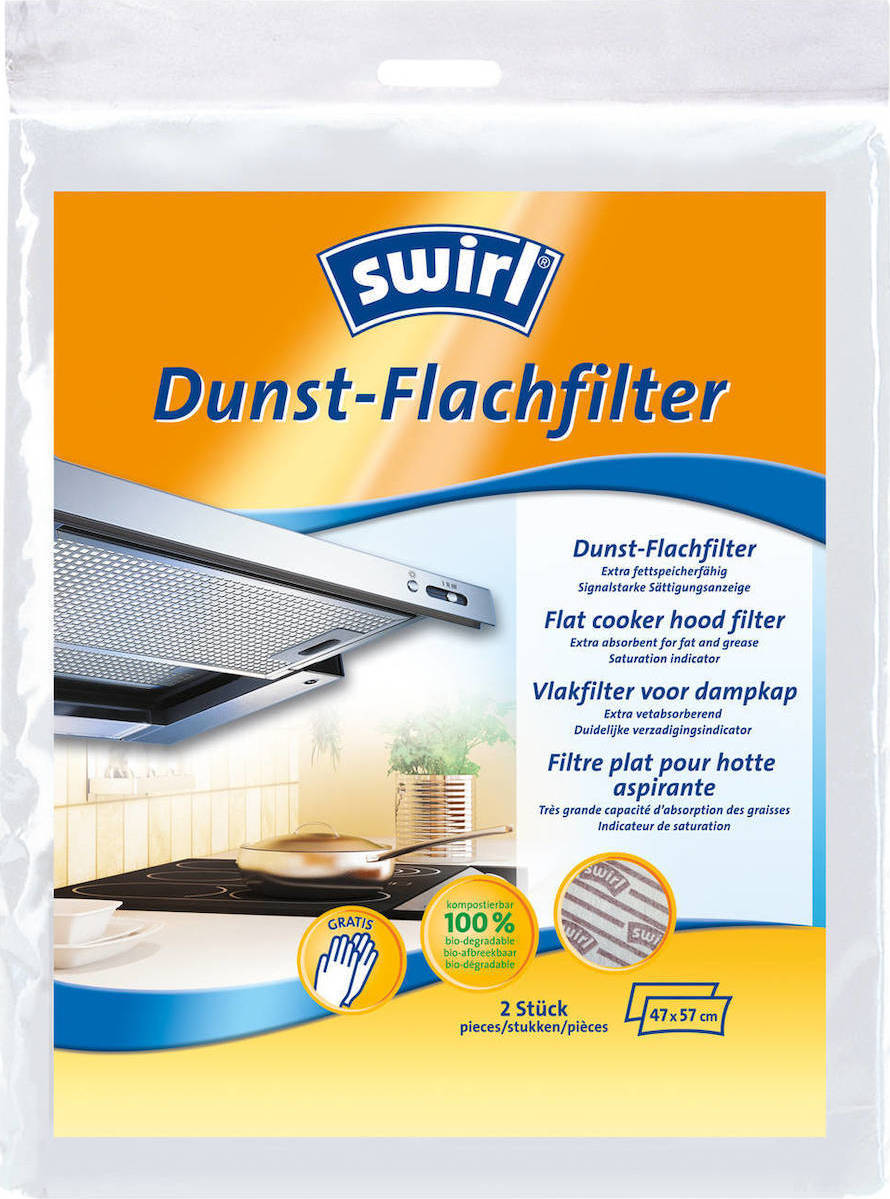 Φίλτρο απορροφητήρα Vlies Dunstfilter από τη Swirl, για επιπλέον απορροφητικότητα στα λίπη. Με ιδιαίτερο σύστημα φιλτραρίσματος 2 σταδίων και με ένδειξη αλλαγής φίλτρου, είναι κατάλληλα για όλους τους συνήθεις τύπους απορροφητών. Στη συσκευασία περιέχονται 2 τεμάχια φίλτρων για απορροφητήρες και ζευγάρι γάντια μιας χρήσης.
